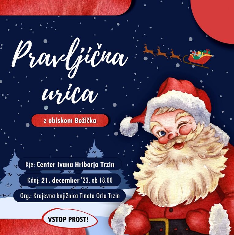 Krajevna knjižnica Tineta Orla Trzin vabi na PRAVLJIČNO URICO Z OBISKOM BOŽIČKA, ki bo v četrtek, 21. decembra 2023, ob 18. uri, v Centru Ivana Hribarja, Trzin.