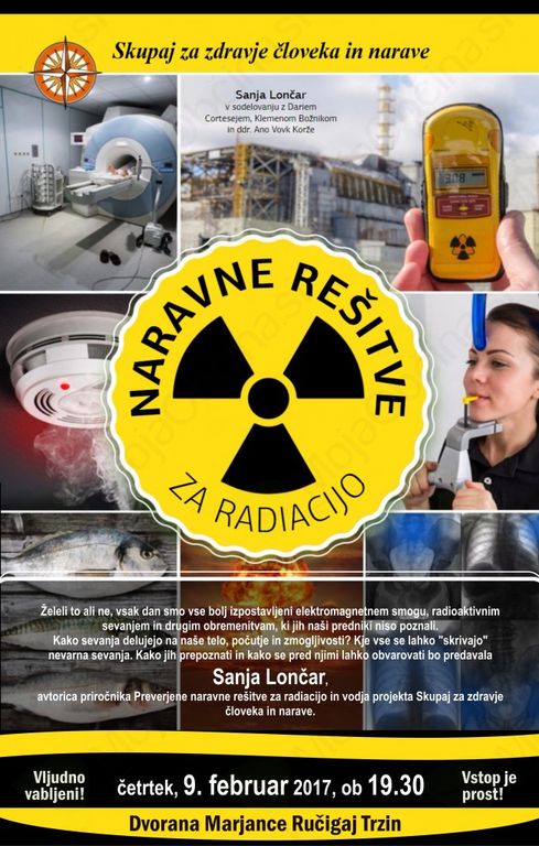 Predavanje NARAVNE REŠITVE ZA RADIACIJO, v četrtek, 09. februarja 2017, ob 19.30 uri, v dvorani Marjance Ručigaj v Trzinu. Predavala bo SANJA LONČAR.