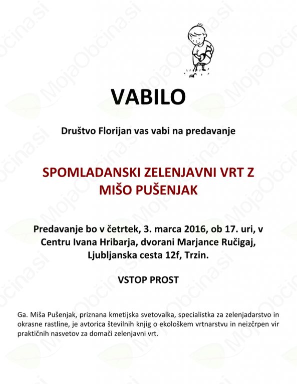 Društvo Florijan vabi na predavanje z naslovom: SPOMLADANSKI ZELENJAVNI VRT Z MIŠO PUŠENJAK. Predavanje bo v četrtek, 3. marca 2016, ob 17.00 uri v dvorani Marjance Ručigaj, na Ljubljanski cesti 12f, Trzin.