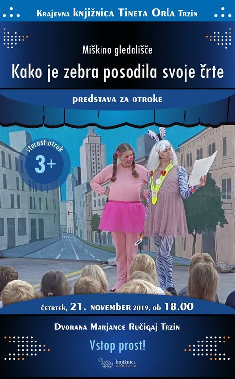 Krajevna Knjižnica Tineta Orla Trzin - predstava za otroke: KAKO JE ZEBRA POSODILA SVOJE ČRTE, v četrtek, 21. novembra 2019, ob 18. uri, v dvorani Marjance Ručigaj.