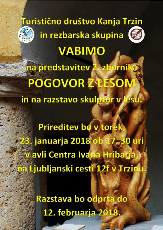 TD Kanja in rezbarska skupina vabita na predstavitev 2. zbornika POGOVOR Z LESOM in na razstavo skulptur v lesu. Prireditev bo v torek, 23.01.2018, ob 17.30 uri, v avli Centra Ivana Hribarja. Razstava bo na ogled do 12.02.2018!