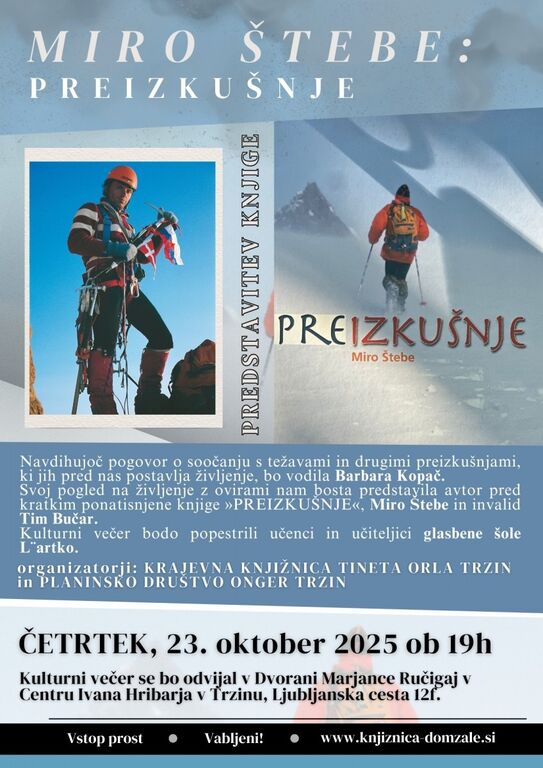 Krajevna knjižnica Tineta Orla Trzin in Planinsko društvo Onger Trzin vabita na predstavitev knjige Mira Štebeta: PREIZKUŠNJE. Svoj pogled na življenje z ovirami bosta predstavila avtor knjige Miro Štebe in invalid Tim Bučar.