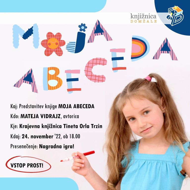 Krajevna Knjižnica Tineta Orla Trzin vabi na predstavitev knjige MOJA ABECEDA, avtorice Mateje Vidrajz, v četrtek, 24. novembra 2022, ob 18. uri.