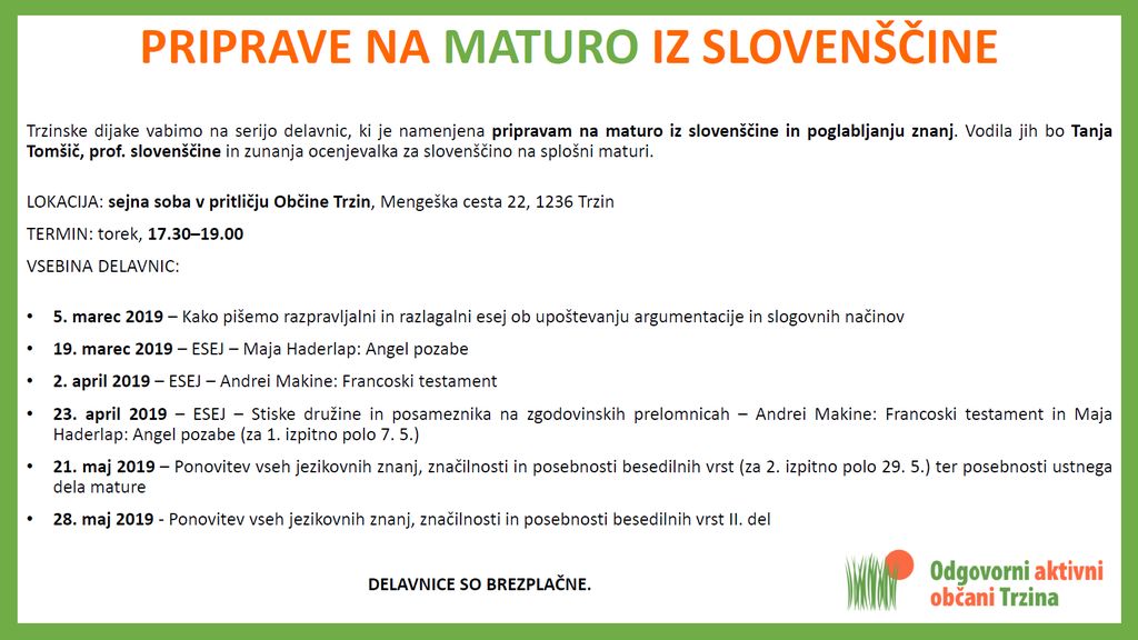 Trzinske dijake vabimo na serijo delavnic, ki je namenjena pripravam na maturo iz slovenščine in poglabljanju znanj. Vodila jih bo Tanja Tomšič, prof. slovenščine in zunanja ocenjevalka za slovenščino na splošni maturi.