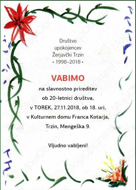 Prireditev ob 20- letnici Društva upokojencev Žerjavčki, v torek, 27. novembra 2018, ob 18. uri.