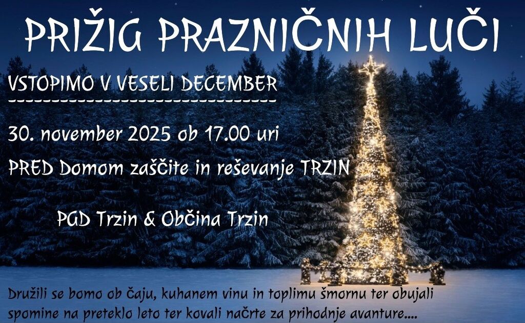 PGD Trzin in Občina Trzin vabita na PRIŽIG PRAZNIČNIH LUČI, v nedeljo, 30. novembra 2025, ob 17. uri, pred Domom zaščite in reševanja Trzin.