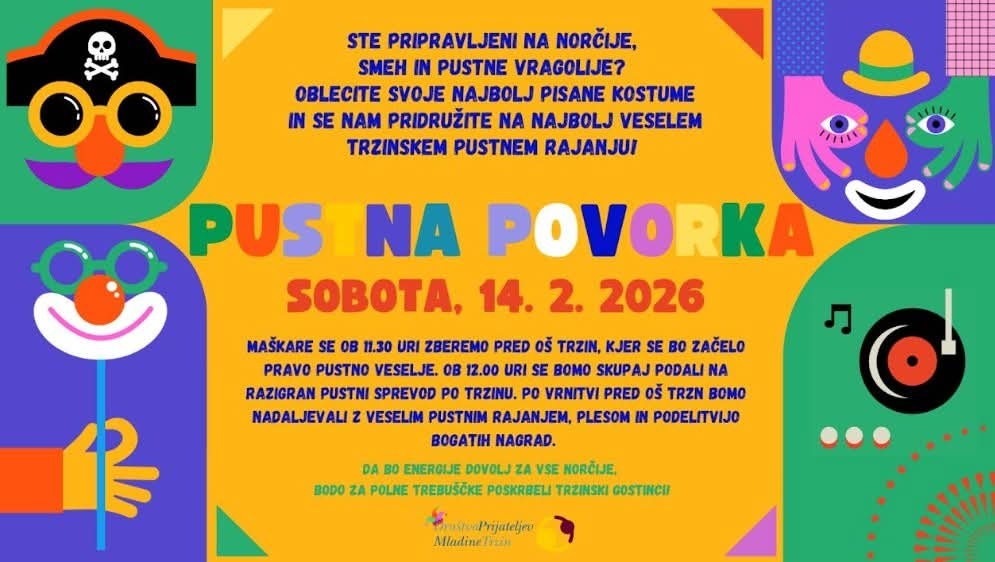 Društvo prijateljev mladine Trzin vabi na PUSTNO POVORKO, v soboto, 14. februarja 2026.