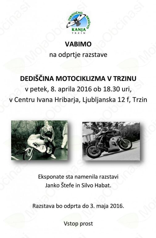 Turistično društvo Kanja vabi na odprtje razstave: DEDIŠČINA MOTOCIKLIZMA V TRZINU, ki bo v petek, 8. aprila 2016, ob 18.30 uri, v Centru Ivana Hribarja, na Ljubljanski cesti 12 f v Trzinu. Razstava bo odprta do 03.05.2016!