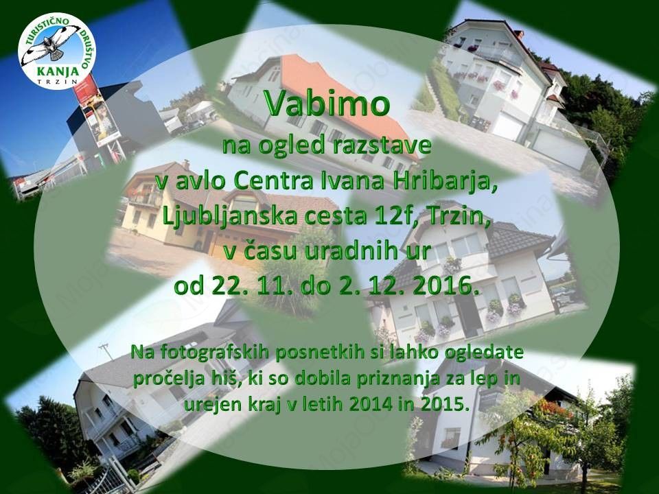 Vabljeni na ogled razstave fotografskih posnetkov pročelij hiš, ki so dobila priznanja za lep in urejen kraj v letih 2014 in 2015. Razstava je na ogled v avli Centra Ivana Hribarja, od 22.11.2016 do 02.12.2016, v času uradnih ur Centra Ivana Hribarja.