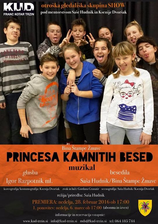 Trzinski teater III. triade osnovne šole, Show skupina, se bo 28. februarja 2016 ob 17. uriv Kulturnem domu Trzin premierno predstavil z mjuziklom »Princesa kamnitih besed«. Več na www.kud-trzin.si.