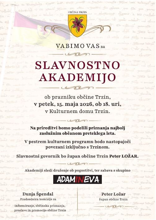 Vabljeni na Slavnostno akademijo ob prazniku Občine Trzin, ki bo v petek, 15. maja 2026, ob 18. uri, v Kulturnem domu Trzin, Mengeška cesta 9, Trzin.
