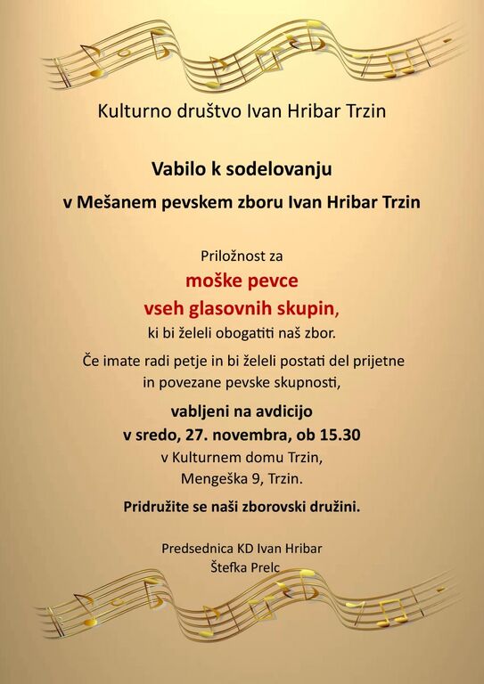 Kulturno društvo Ivan Hribar Trzin vabi k sodelovanju v Mešanem pevskem zboru Ivan Hribar Trzin. Priložnost za moške pevce vseh glasovnih skupin. Vabljeni na avdicijo v sredo, 27. novembra, ob 15.30 v Kulturni dom Trzin.