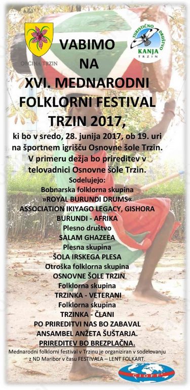 Mednarodni folklorni festival, v sredo, 28. junija 2017, ob 19.00 uri, na športnem igrišču Osnovne šole Trzin. Več v prilogi!