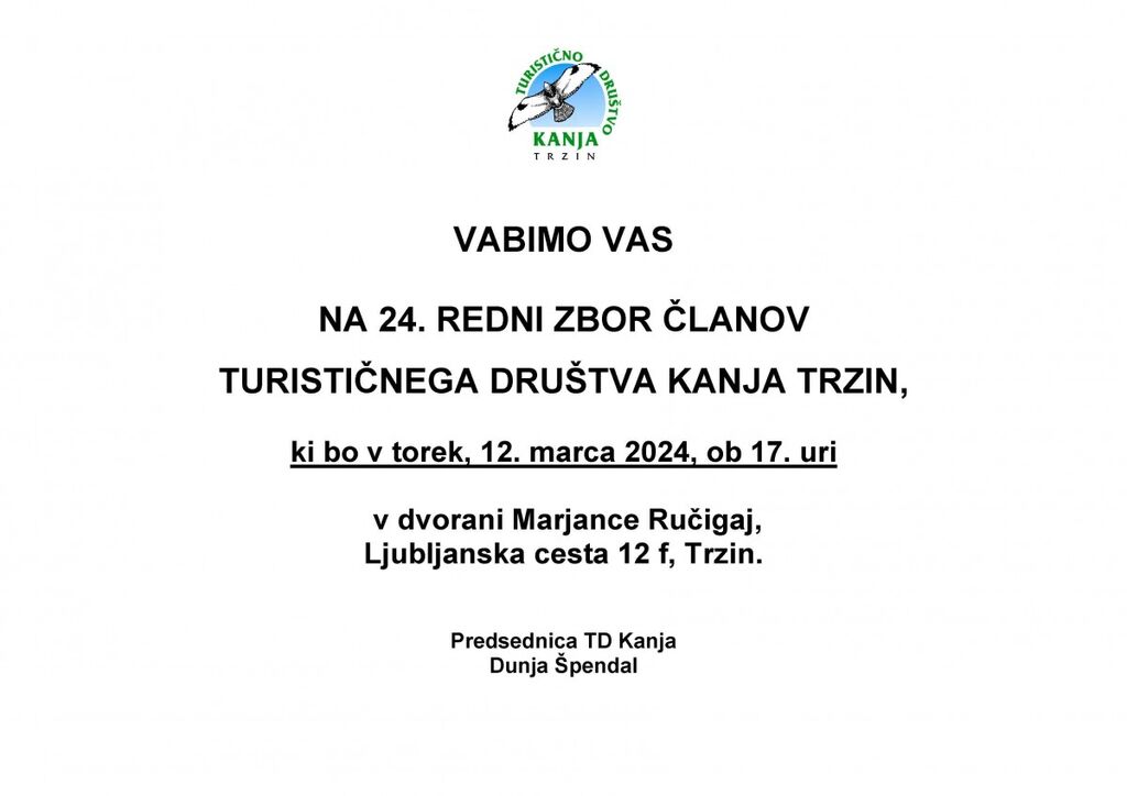 Turistično društvo Kanja Trzin vabi na 24. redni letni zbor članov, ki bo v torek, 12. marca 2024, ob 17. uri,v dvorani Marjance Ručigaj.