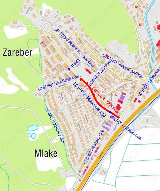 Zainteresirano javnost obveščamo, da je Občina Trzin izdala podjetju Lavaco, d. o. o. iz Ljubljane dovoljenje št. 371-0019/2018-2 z dne 5. 9. 2018 za popolno zaporo dela Mlakarjeve ulice 1-8 v Trzinu, zaradi sanacije cestišča, hodnika za pešce, obnove cestne razsvetljave, izgradnje kanalizacije za odvod odpadne padavinske vode in prometne signalizacije.