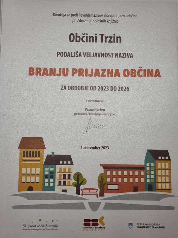 Naziv Branju prijazna občina je Občina Trzin prvič pridobila leta 2017, veljavnost je podaljšala leta 2020 in ponovno tudi letošnje leto.