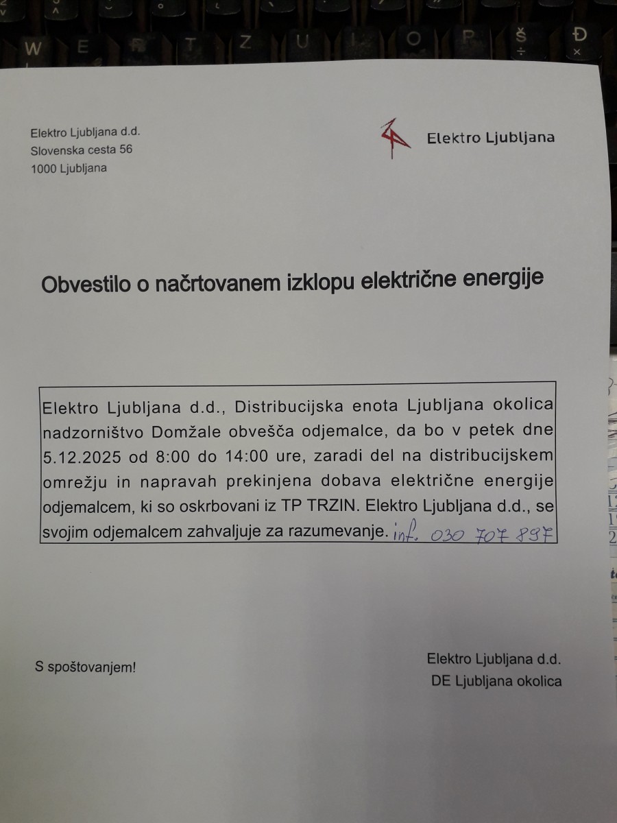 Spoštovani občanke in občani, obveščamo vas, da zaradi vzdrževalnih del na elektro omrežju, v petek, 5. 12. 2025, preko stacionarnih telefonov ne bomo dosegljivi.