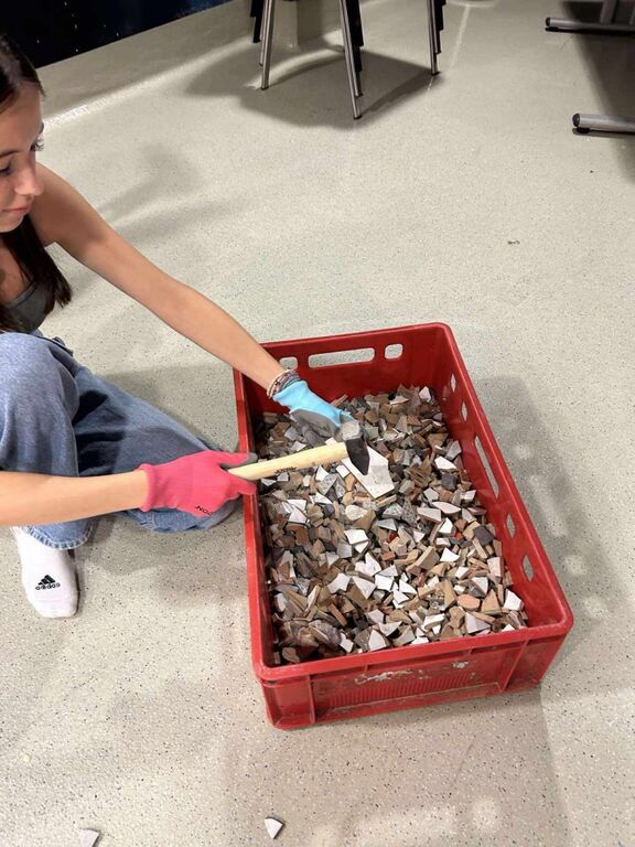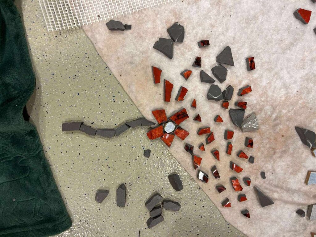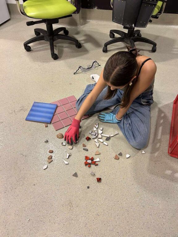 Na tretjem srečanju smo se lotili obdelave ploščic. Keramične ploščice smo razbili na manjše kose, nato pa vsak košček dodatno oblikovali s kleščami za keramiko. Koščke smo sproti brusili, da smo odstranili ostre robove. Pri delu smo nosili zaščitne rokavice in očala, saj so bili koščki keramike zelo ostri.