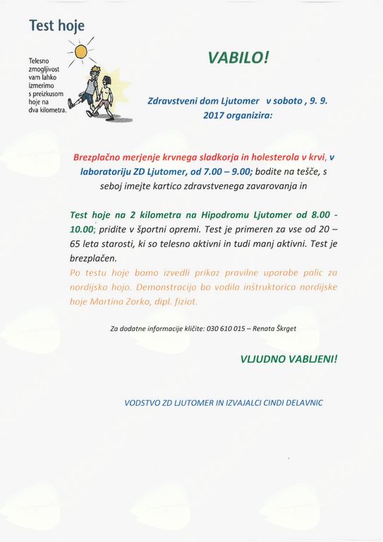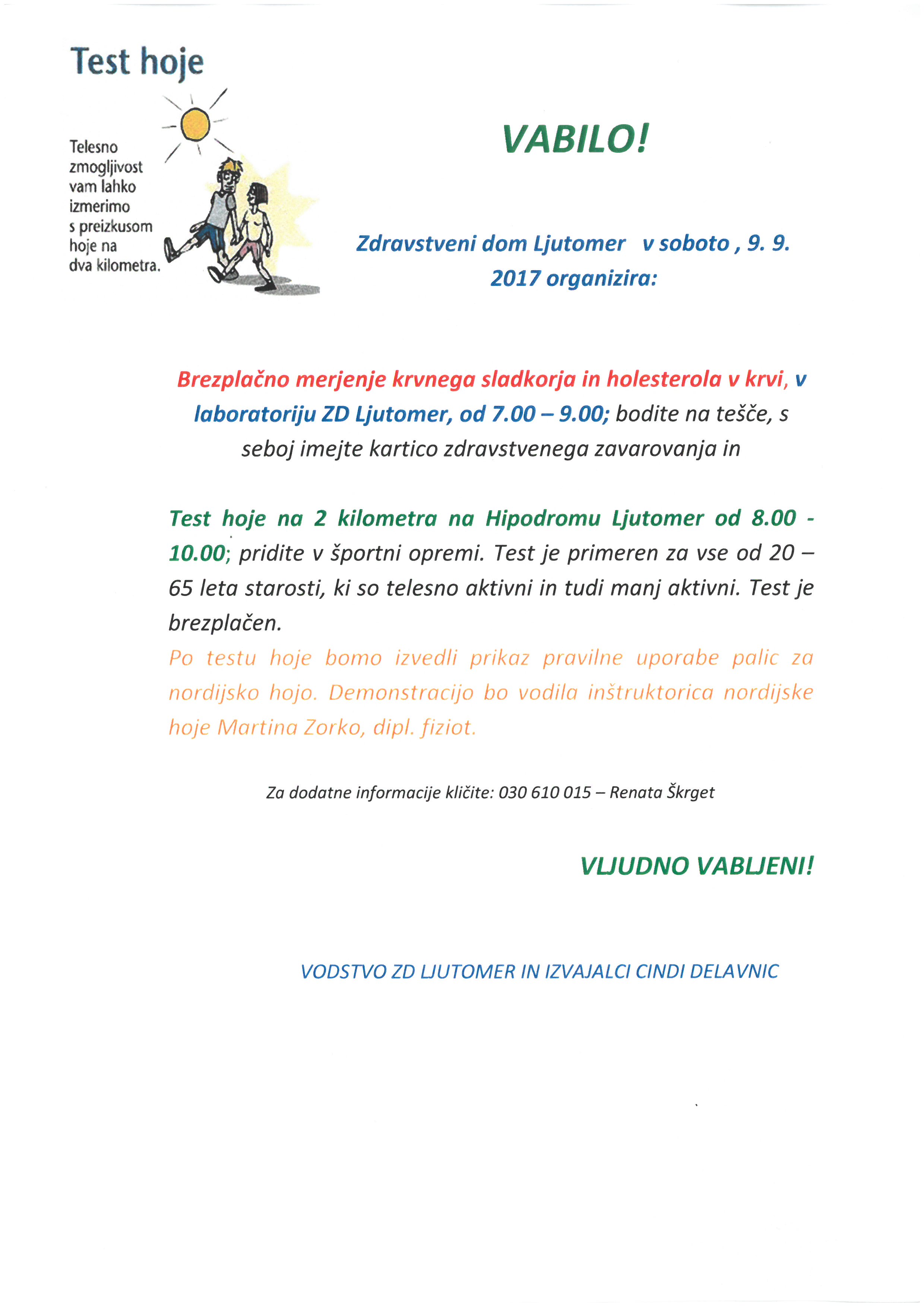 Test hoje na 2 km na Hipodromu Ljutomer od 8:00 do 10:00 - pridite v športni opremi. Test je primeren za vse od 20. do 65. leta starosti, ki so telesno aktivni in manj aktivni.
