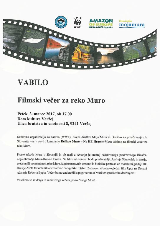 Svetovna organizacija za naravo (WWF), Zveza društev Moja Mura in Društvo za preučevanje rib Slovenije vas v okviru kampanje Rešimo Muro – Ne HE Hrastje-Mota vabimo na filmski večer za reko Muro.