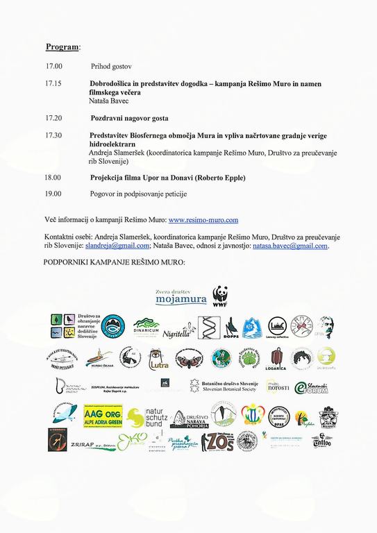 Kontaktni osebi: Andreja Slameršek, koordinatorica kampanje Rešimo Muro, Društvo za preučevanje rib Slovenije: slandreja@gmail.com; Nataša Bavec, odnosi z javnostjo: natasa.bavec@gmail.com.