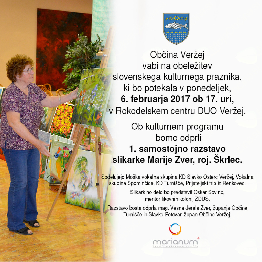 Občina Veržej vabi na obeležitev slovenskega kulturnega praznika. Ob kulturnem programu bomo odprli 1. samostojno razstavo slikarke Marije Zver, roj. Škrlec.