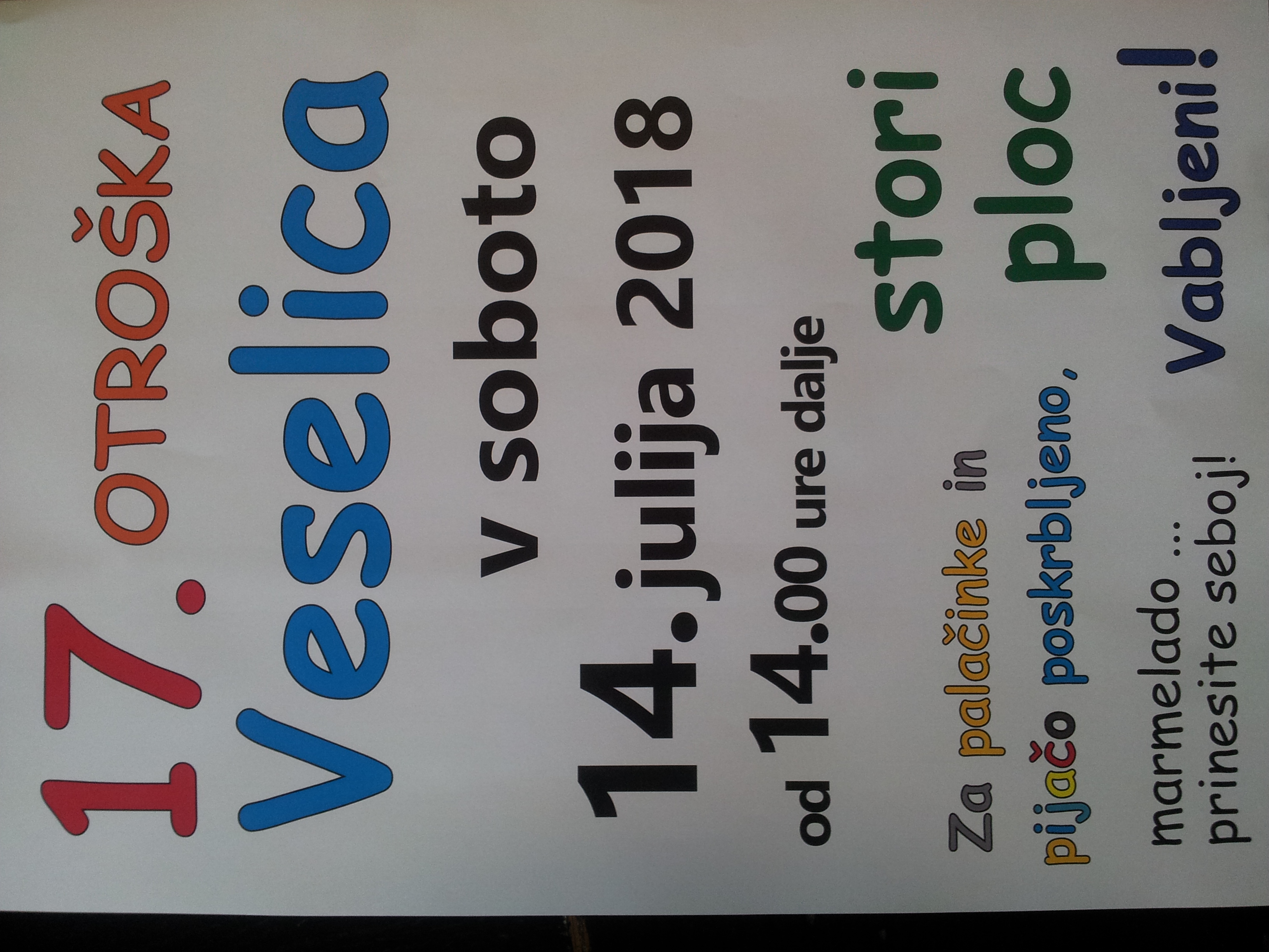 Vabimo vas na že tradicionalno otroško veselico na Stori ploc, v soboto 14. julija 2018, od 14. ure dalje. Za palačinke in pijačo bo preskrbljeno, marmelado ali sladki namaz pa prinesite s sabo.