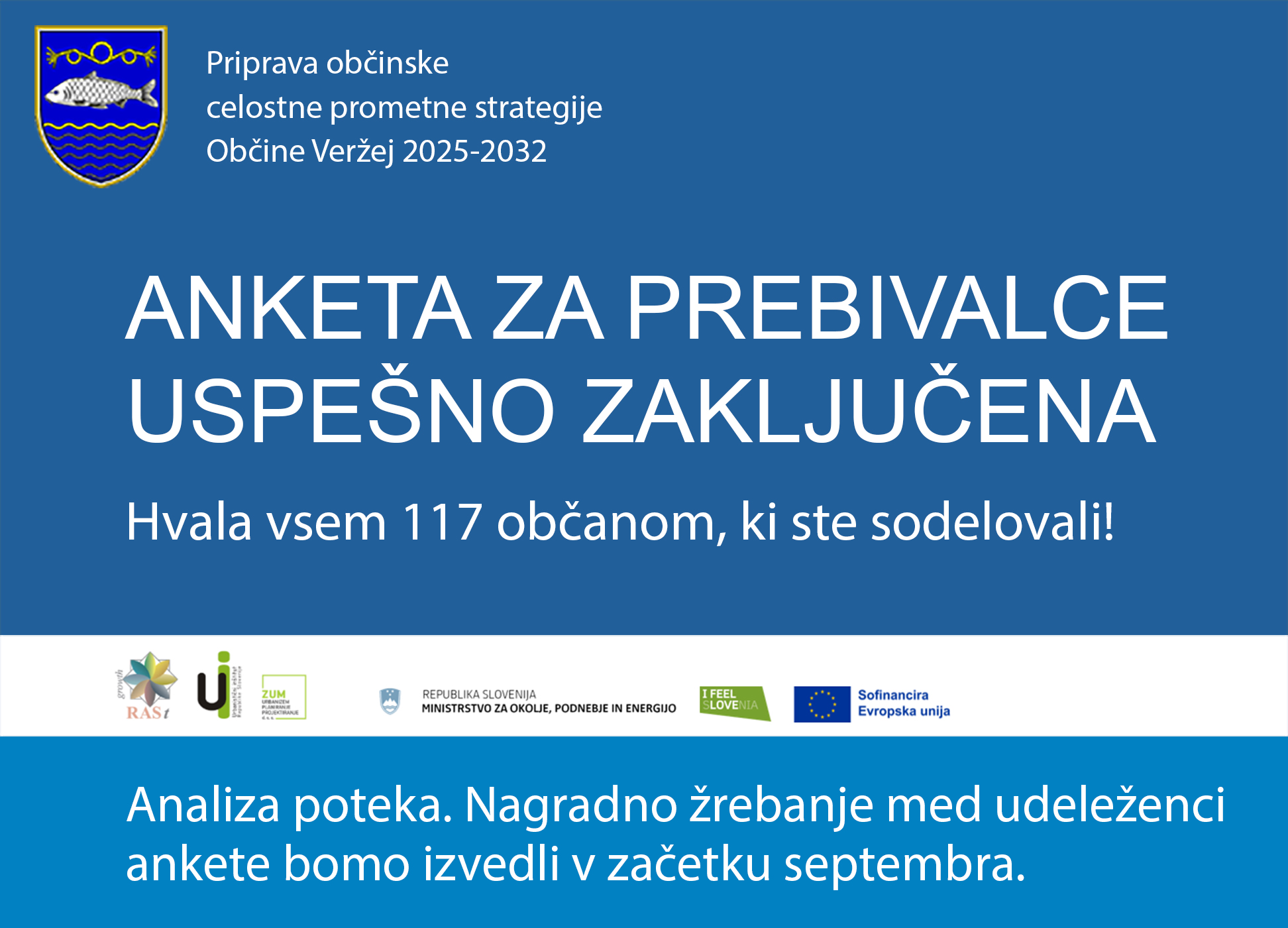iskreno se vam zahvaljujemo za sodelovanje v anketi za prebivalce, ki predstavlja pomemben del priprave občinske celostne prometne strategije (OCPS). Z vašo pomočjo smo uspeli v vseh štirih občinah zbrati skupno 799 izpolnjenih anket, kar nam bo omogočilo pripravo bolj kakovostnih in lokalnim razmeram prilagojenih vsebin ter boljše načrtovanje in prilagajanje ukrepov.