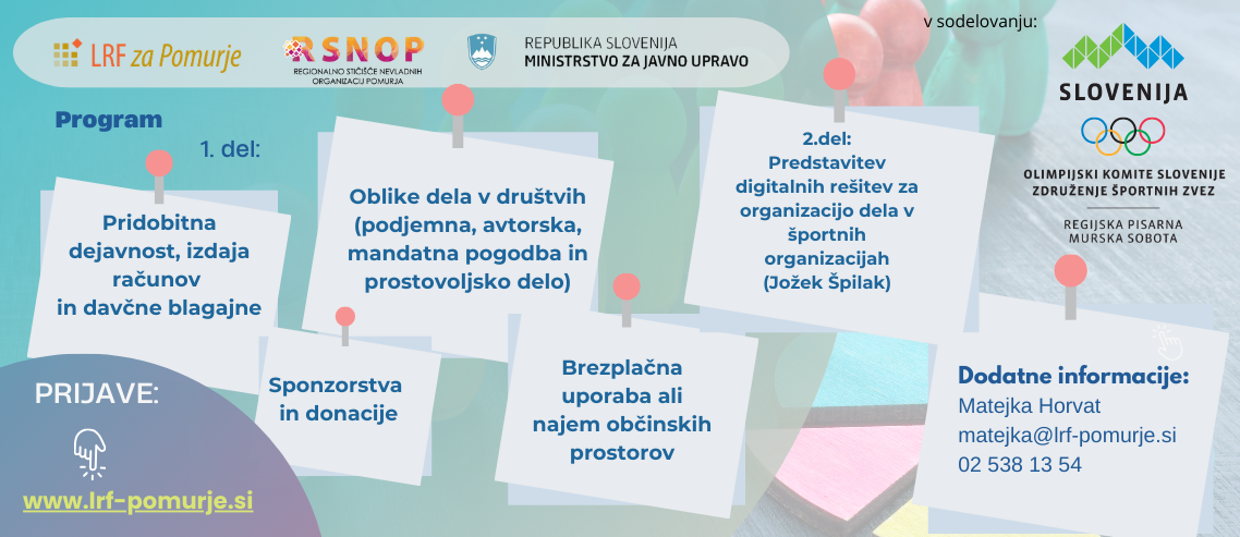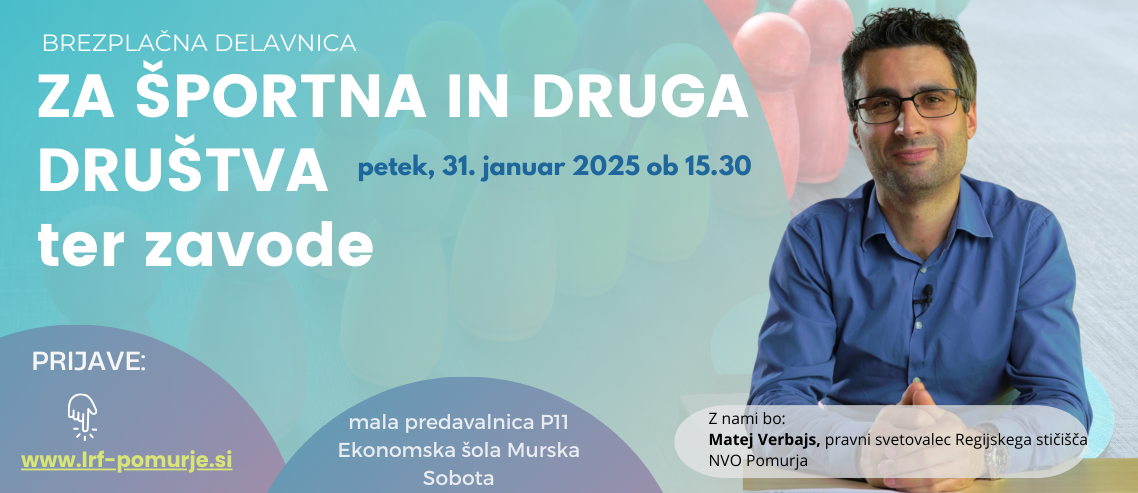 Lokalna razvojna fundacija za Pomurje v okviru Regionalnega stičišča nevladnih organizacij Pomurja nadaljuje serijo brezplačnih delavnic za društva in zavode o aktualnih pravnih temah. Tokrat delavnico soorganiziramo v sodelovanju z OKS – Združenjem športnih zvez regijsko pisarno Murska Sobota.
