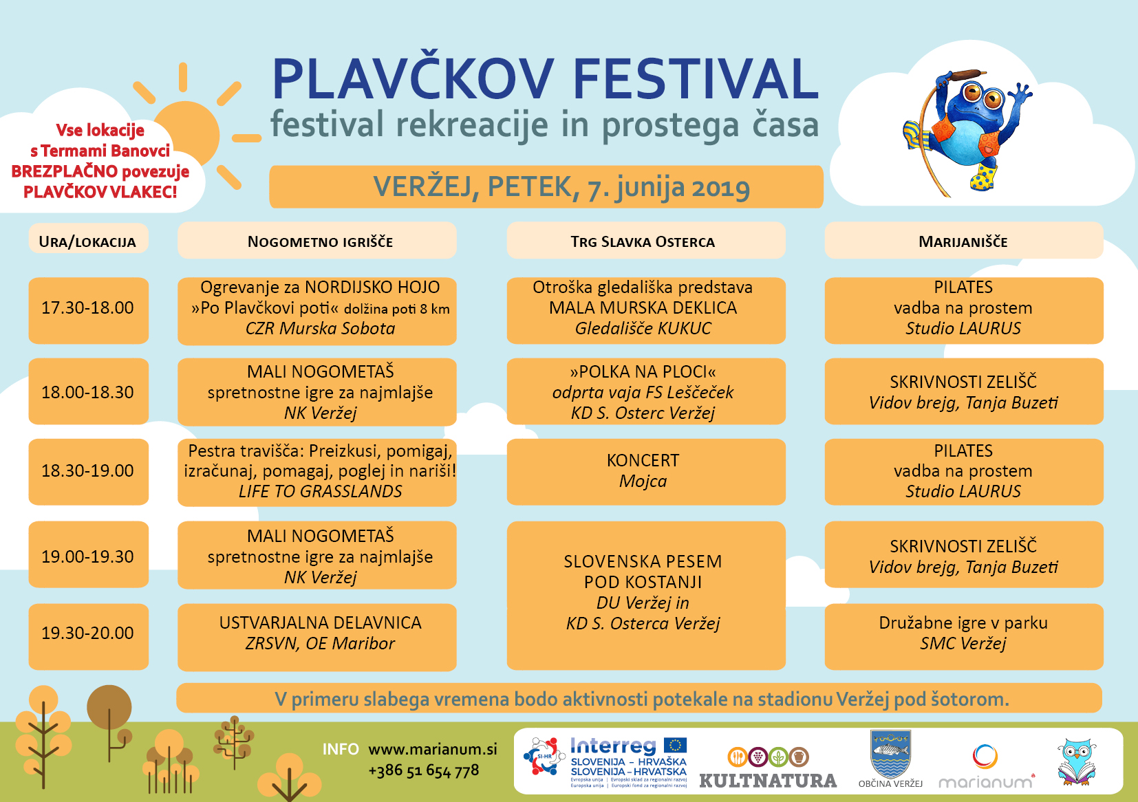 Spoštovani, 7.6.2019 se bo v Veržeju odvijalo veliko zanimivih stvari - poleg dokodka 24 ur z reko Muro se že drugo leto zapored trudimo pripraviti festival rekreacije in prostega časa - Plavčkov festival. Letos plavčkov festival ponuja veliko zanimivih športno-kulturnih izobraževalnih vsebin na treh lokacijah, ki jih povezuje Plavčkov vlakec.