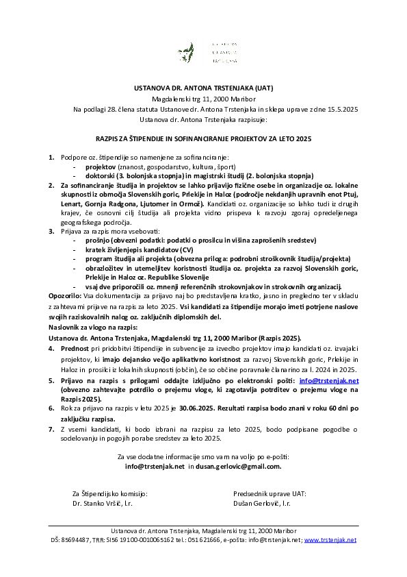 RAZPIS ZA ŠTIPENDIJE IN SOFINANCIRANJE PROJEKTOV ZA LETO 2025