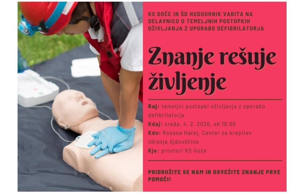 KS Goče in ŠD Hudournik vabita na delavnico o temeljnih postopkih oživljanja z uporabo defibrilatorja. Delavnica bo potekala v sredo, 4. 2. 2026, ob 18.00 v prostorih KS Goče.
