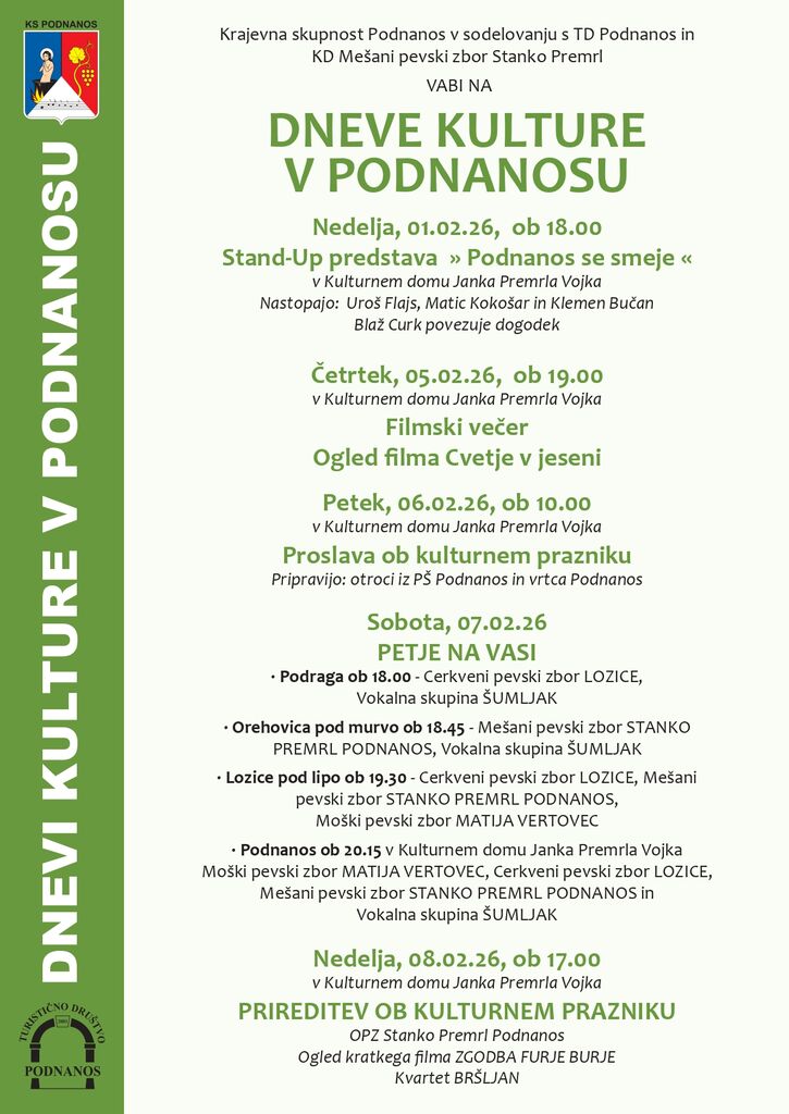 Vabljeni na dneve kulture v Podnanos, ki bodo potekali od nedelje 1.2.2026 do nedelje 8.2.2026.