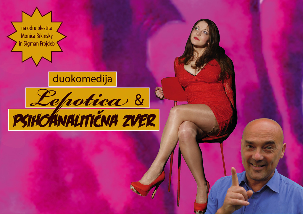 Monika Jekler v vlogi Monice Bikinsky z modrcem številka XXL in Roman Vodeb v vlogi seksologa Sigmana Frojdeba v predstavi, kot je na slovenskih odrih še ni bilo!