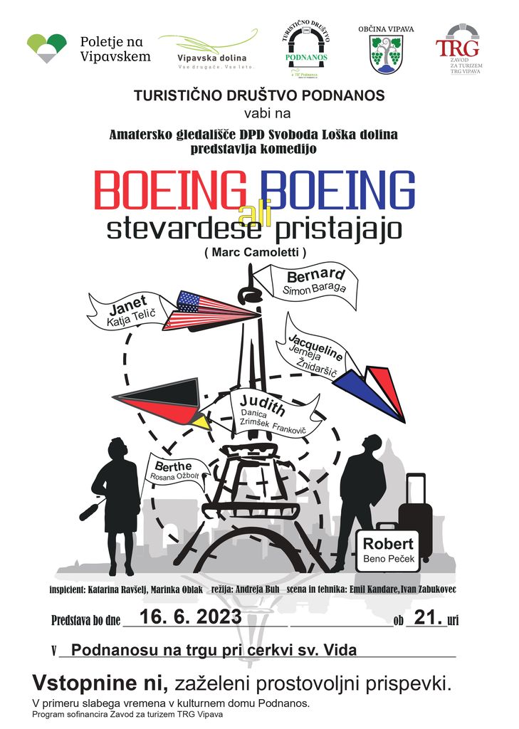 komedijo BOEING BOEING ali stevrdese pristajajo. Predstava bo v petek 16.6.2023 ob 21. uri v Podnanosu, na trgu pri cerkvi sv. Vida.