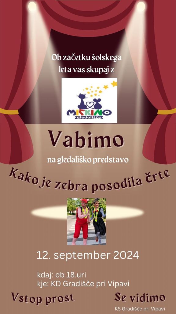 Dragi otroci, KS Gradišče pri Vipavi vas ob začetku šolskega leta vabi v četrtek, 12. 9. ob 18. uri na gledališko predstavo ´Kako je zebra posodila črte´. Prestava bo v Kulturnem domu na Gradišču pri Vipavi.