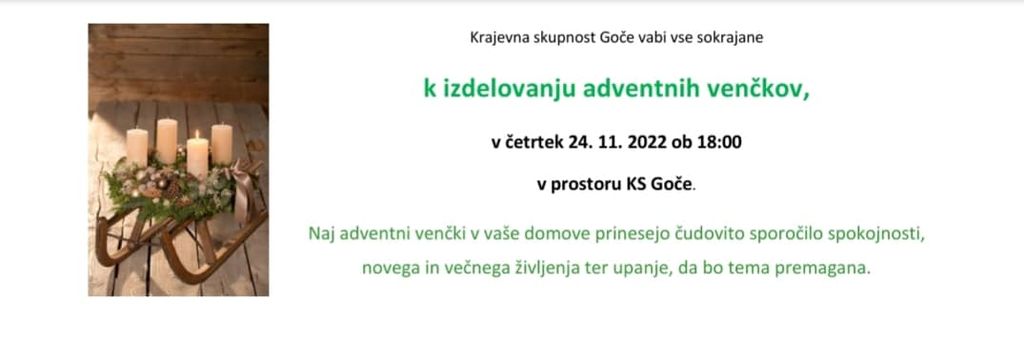 Krajevna skupnost Goče vabi vse sokrajane k izdelovanju adventnih venčkov, v četrtek 24.11.2022 ob 18:00 v prostor KS Goče.