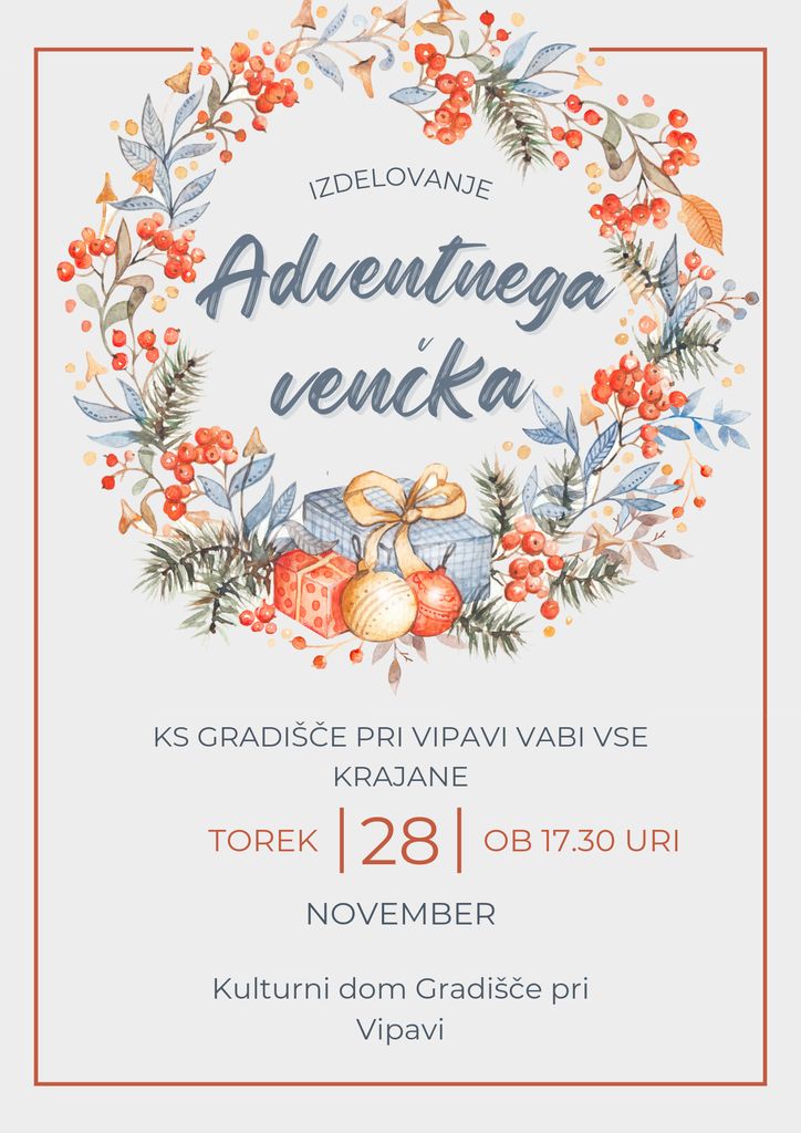 Krajevna skupnost Gradišče pri Vipavi vabi vse krajane na izdelovanje advetnega venčka, ki bo v torek, 28. novembra ob 17.30 uri, v Kulturnem domu Gradišče pri Vipavi.