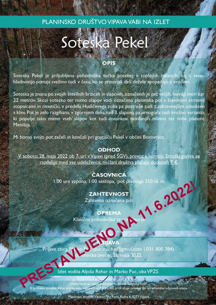 Planinsko društvo Vipava vabi na izlet v sotesko Pekel.