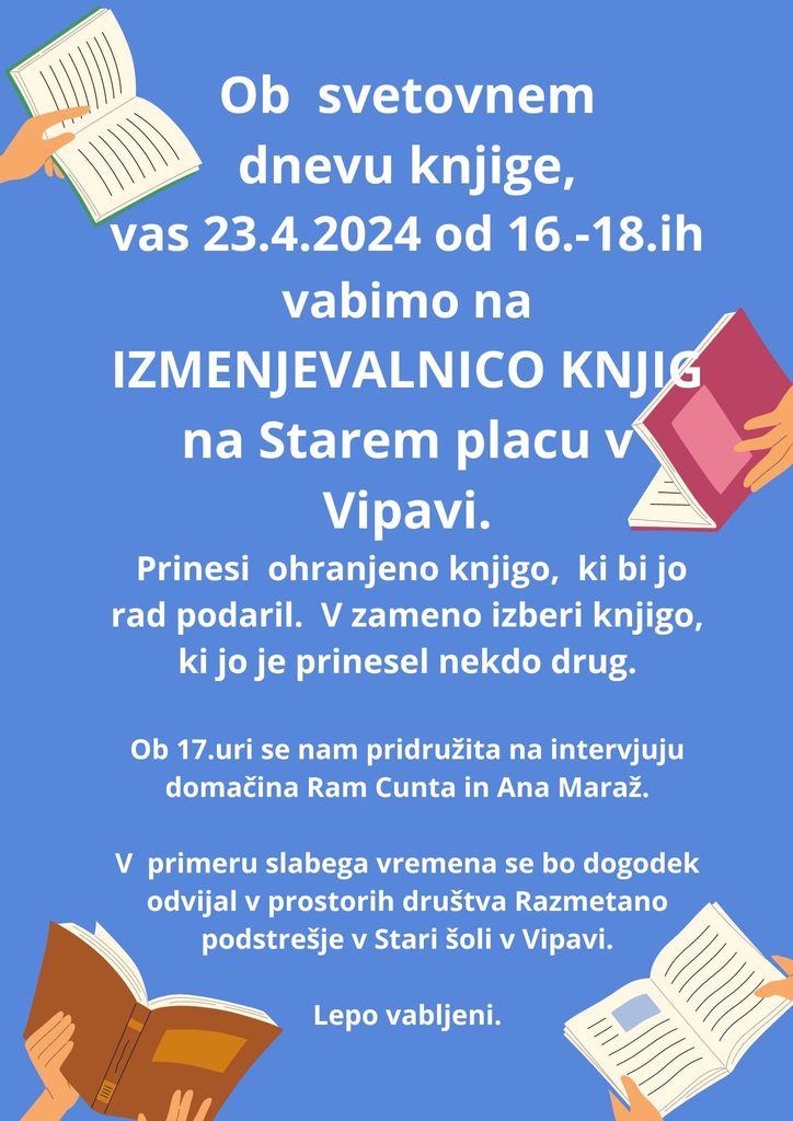 Ob svetovnem dnevu knjige, vas društvo razmetano podstrešje vabi v torek, 23.4.2024 od 16.00 - 18.00 na IZMENJEVALNICO KNJIG na Starem placu v Vipavi.