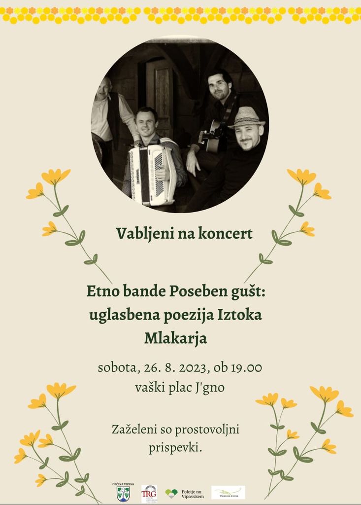 V soboto 26.8.2023 ob 19.00, vabljeni na koncert Etno bande Poseben gušt, kateri izvajajo izključno pesmi Iztoka Mlakarja.