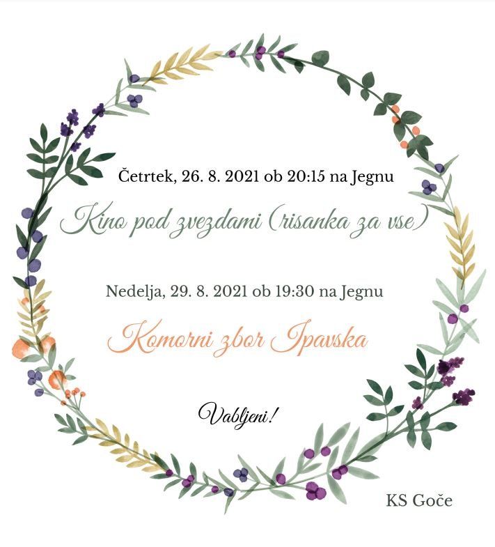 V nedeljo 29. 8. 2021 ob 19:30 pa bo na vaškem placu Jegn (Goče), nastop komornega zbora Ipavska.