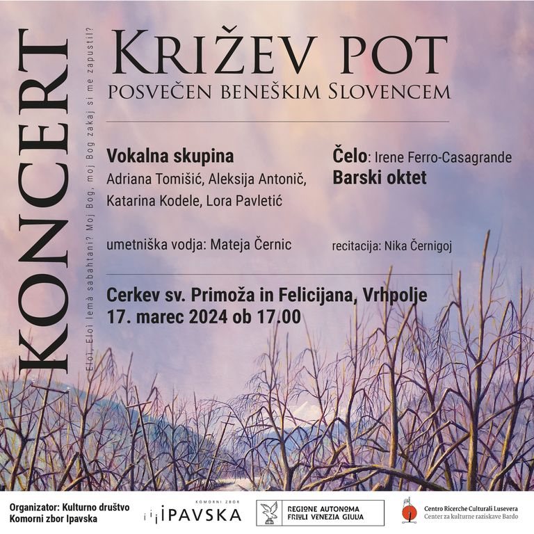 KD Ipavska vabi na Križev pot posvečen Beneškim Slovencem. Koncert bo v nedeljo, 17. marca 2024 ob 17.00, v cerkvi sv. Primoža in Felicijana Vrhpolje.