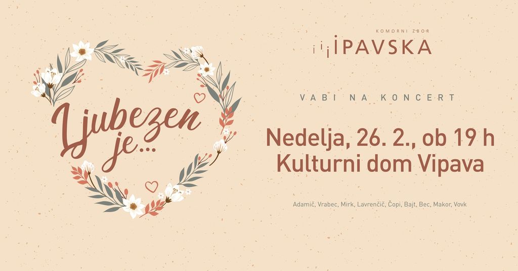 Komorni zbor Ipavska vas vabi, da se udeležite koncerta "Ljubezen je...". Koncert bo v nedeljo, 26.2. ob 19h v Kulturnem domu v Vipavi.