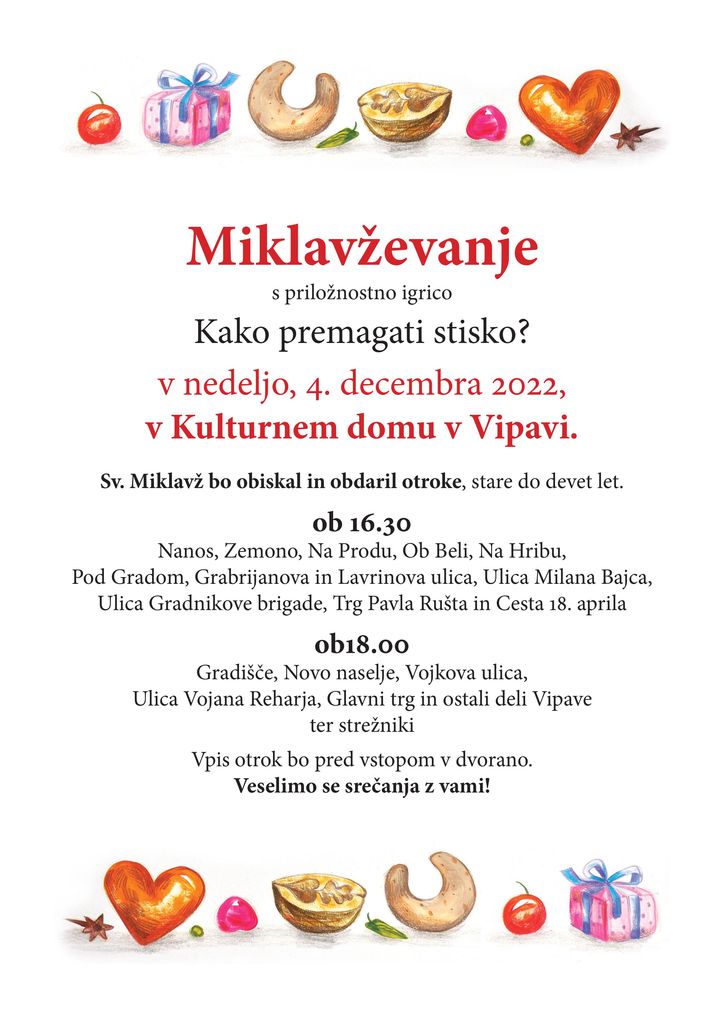 Miklavževanje s priložnostno igrico Kako premagati stisko?, v nedeljo, 4. decembra 2022, v Kulturnem domu v Vipavi.