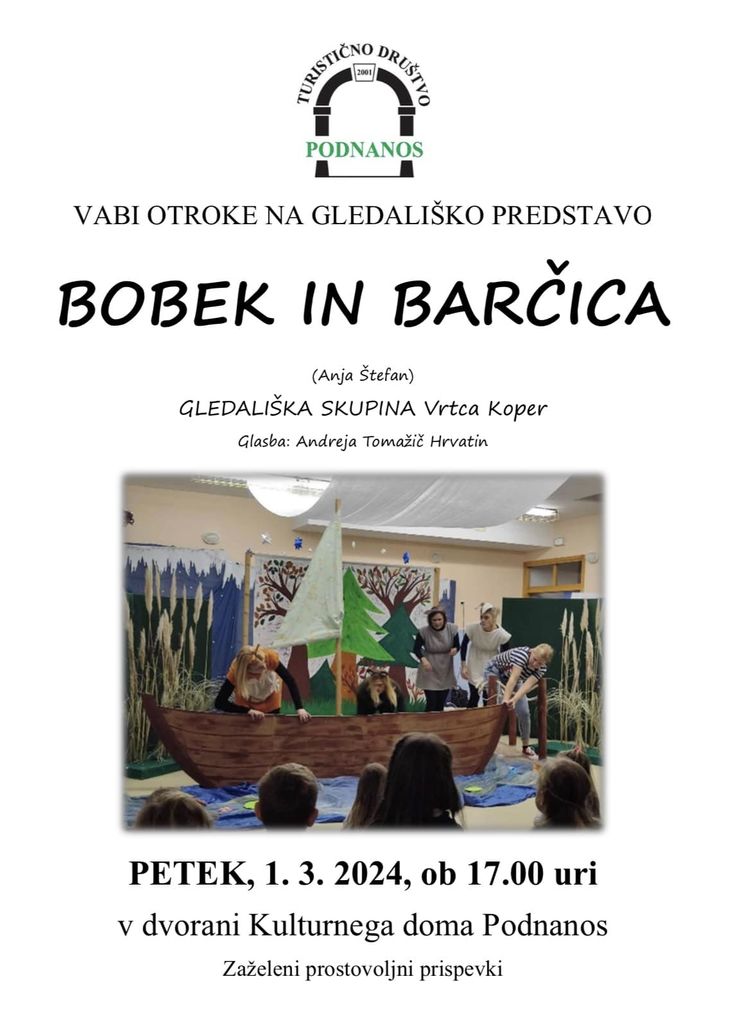 Vabljeni na otroško predstavo Bobek in barčica, ki bo 1.3.2024 ob 17.00, v Kulturnem domu Podnanos.