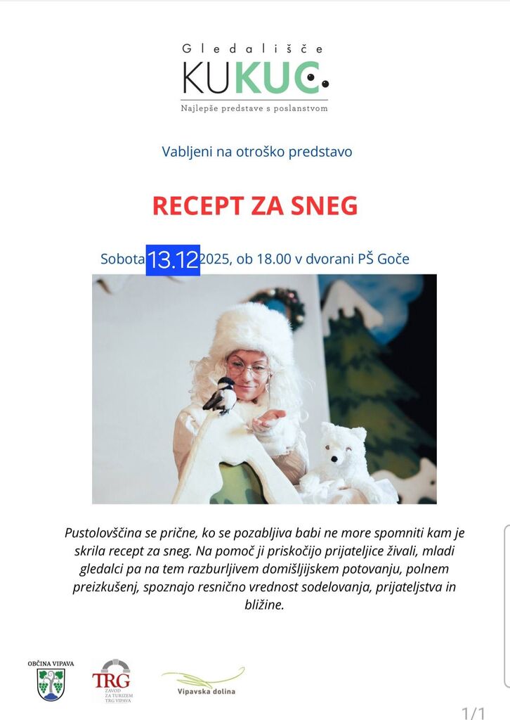 Krajevna skupnost Goče vabi na ogled otroške predstave Recept za sneg, ki bo v soboto 13.12.2025 ob 18.00 v dvorano PŠ Goče.