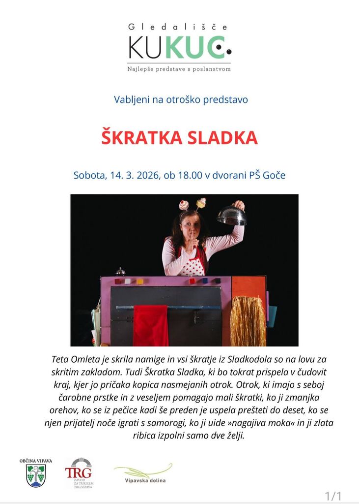 Vabljeni na otroško predstavo Škratka sladka, ki bo v soboto 14.3.2026 ob 18.00 v dvorani PŠ Goče.