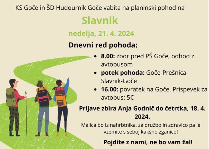 KS Goče in ŠD Hudournik Goče vabita na planinski pohod na Slavnik, v nedeljo. 21.4.2024.