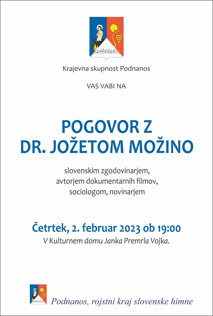 Krajevna skupnost Podnanos vas vabi danes, 2.2. ob 19.00 uri v Kulturni dom v Podnanos na pogovor z dr. Jožetom Možino.